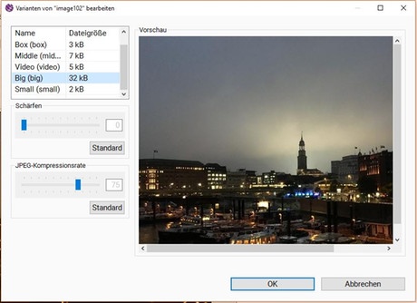 Der Bild-Bearbeiten-Dialog zeigt oben links die Tabelle der bearbeitbaren Varianten, darunter die Einstellungen und rechts eine Vorschau. Die Einstellungen und die Vorschau beziehen sich auf die in der Tabelle selektierte Variante.